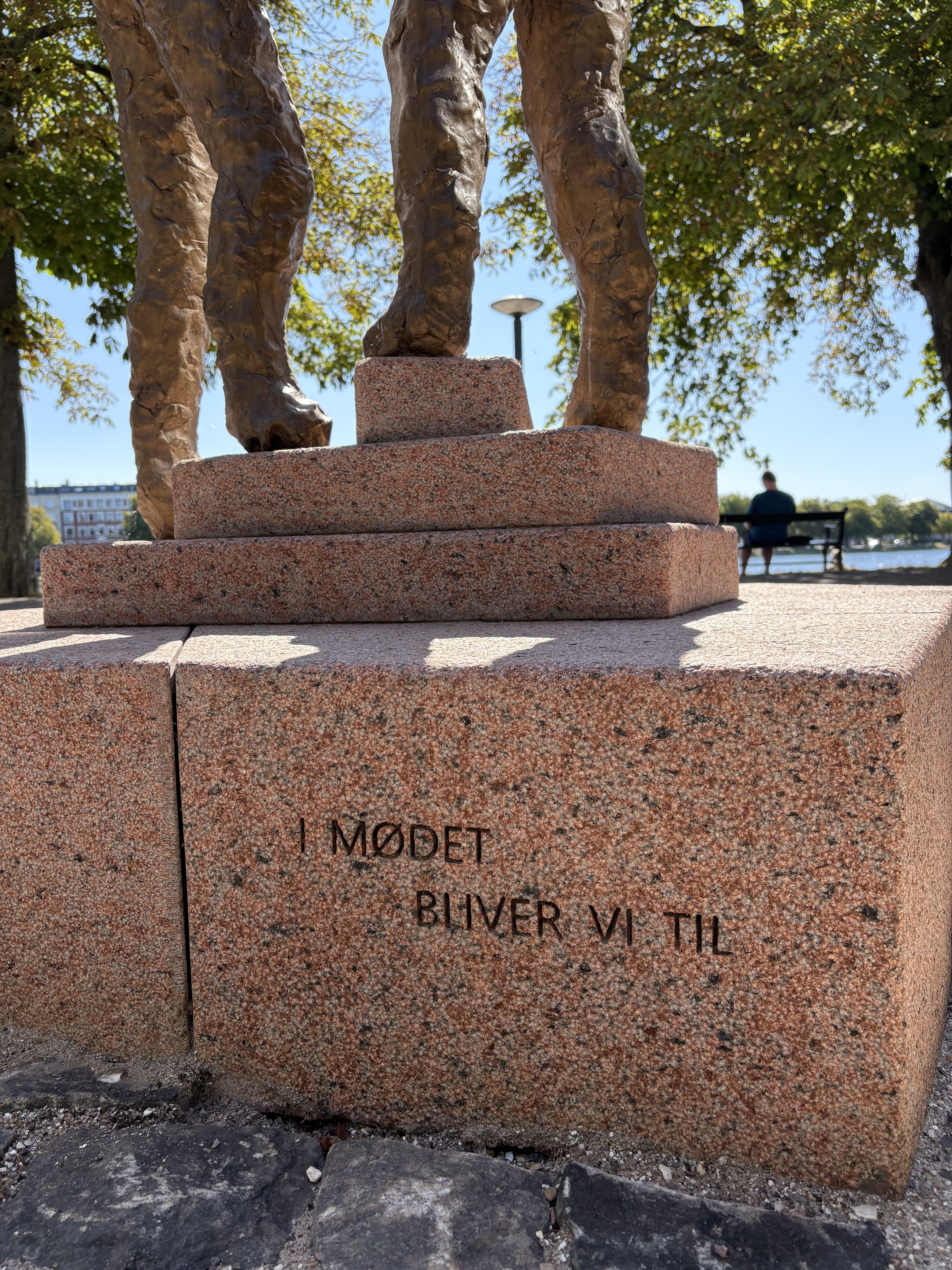 På sokkelen er der indgraveret : “I MØDET BLIVER VI TIL”